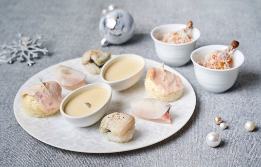 冬の食材を取り入れたセイヴォリーも真っ白な装いで登場します。炙った鰻と爽やかな山椒が香る「鰻てまり寿司」や、滑らかな口どけと白子の旨味が感じられる「白子のフラン」、トマトやキュウリ、白菜の特製マヨネーズサラダの上に、低温調理でしっとり仕上げた鶏むね肉をかぶせた「チキンスモーブロー」、そして煮出した大根の上にブリを重ね、生姜やミョウガ、昆布の和風ドレッシングで味付けしてスライス大根のマリネで覆った「ホワイトブリ大根」など、目でも舌でも季節を感じるセイヴォリーをお届けします。別皿でご提供する「チーズフライドチキン」は、一口サイズのフライドチキンにたっぷりパルメザンチーズを削り、揚げたてをお召し上がりいただけます。