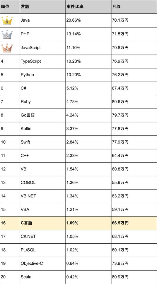 C言語案件の平均月額単価は66.2万円、平均年収は795万円で年収ランキング18位です。C言語はUNIXとともに誕生した歴史ある手続き型言語で、ポインタ操作と高速実行が強みです。