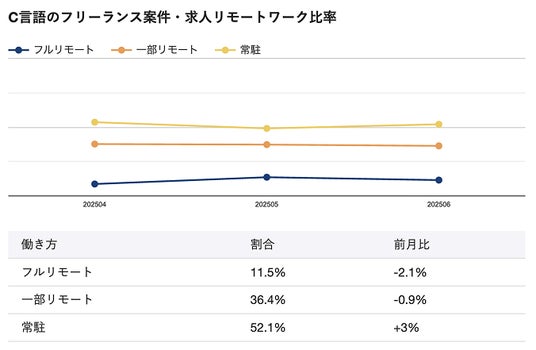 2025年6月時点のC言語フリーランス案件・求人におけるリモートワーク比率は、フルリモートが11.5%、一部リモートが36.4%、常駐が52.1%です。フルリモートは前月比-2.1%、一部リモートも-0.9%縮小しましたが、常駐は+3%増加しています。
