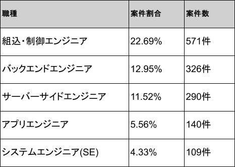 職種では組込・制御エンジニアが22.69%、バックエンドエンジニアが12.95%、サーバーサイドエンジニアが11.52%、アプリエンジニアが5.56%、システムエンジニア(SE)が4.33%とファームウェアから高性能ネットワーク処理まで幅広い需要があります。