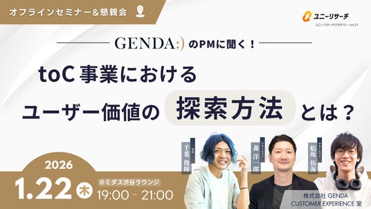 ダイレクトリサーチプラットフォーム「ユニーリサーチ」を運営する株式会社プロダクトフォース(本社:東京都港区、代表取締役CEO 浜岡 宏樹、以下「プロダクトフォース」)と、株式会社GENDA(本社:東京都港区、代表取締役社長CEO:片岡 尚、以下「GENDA」)は、両社共催にてオフラインセミナー「toC事業におけるユーザー価値の探索方法とは?」を2026年1月22日(木)19:00~21:00に開催いたします。