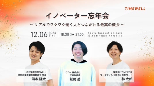 株式会社TIMEWELL(本社:神奈川県横浜市、代表取締役:濱本隆太、以下TIMEWELL)は、2024年12月6日(金)にAI時代の地域イノベーション最前線について語る「イノベーター忘年会」を開催することをお知らせします。当日は鷲尾氏のセッションと、新規事業担当者や東京都suteam若手テクニカルアントレプレナー講座「WARP」受講者との交流会も予定しています。