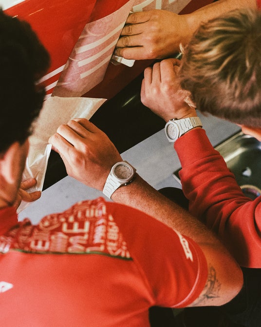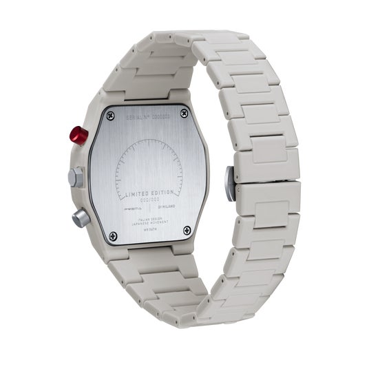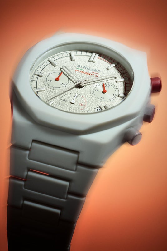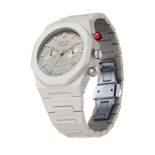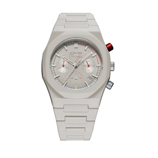 このコラボレーションのベースとなるのは、D1 Milanoの人気シリーズ「ポリカーボン」から誕生した特別仕様のクロノグラフ「ポリクロノ」。文字盤には、レーシングサーキットの荒々しい路面をイメージしたアスファルトグレインのテクスチャが施され、独自の深みと視覚的なインパクトを与えます。ユニークなトープカラーに鮮烈な赤いプッシャーボタンがアクセントとなり、レーシングスピリットを際立たせます。ケースとバンドには、軽量で耐久性に優れたポリカーボネートを使用し、ソフトタッチコーティングが滑らかで心地よい装着感を提供します。高級感と快適さを兼ね備えた、まさに理想的な相棒です。