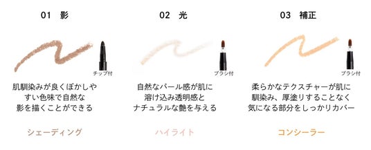 「影・光・補正」の肌に溶け込むような3種類のカラーが、自然な陰影でナチュラルな立体感と奥行きを作り出します。