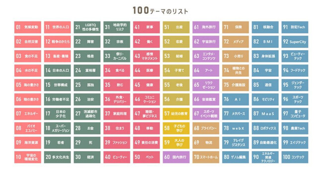 100のテーマで未来の社会実態を予測し、中長期的な未来に向けた事業創造を支援