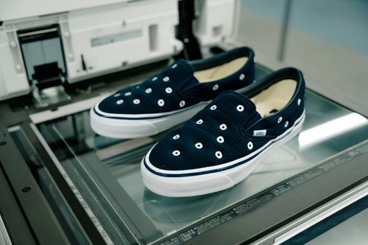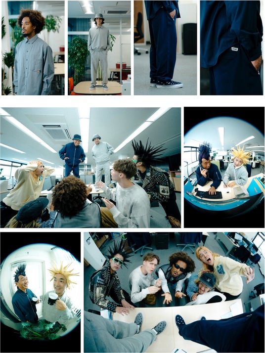 「HARAJUKU PUNK」コレクションでは、ネイビーとグレーで統一したフットウェアとアパレルを展開。フットウェアではVANS PREMIUMシリーズの「PREMIUM SLIP-ON」をベースに、パッド入りのグレンチェックのアッパーに、安全ピンやスタッドを使ってカスタマイズをするパンクファッションのDIY精神に敬意を表し、アイレットをモチーフにした刺繍でドット柄を表現した2モデルが登場。