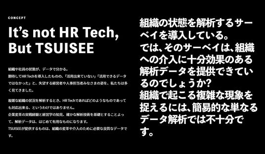 TSUISEEは、1.自社の人や組織の問題を深いレベルで解明すること、2.組織の問題に対する打ち手である人事施策の価値や効果を科学的に解明すること、の2つを同時に行うことができるツールです。リリース時から「他とは一線を画する」ツールとして好評を得てきました。