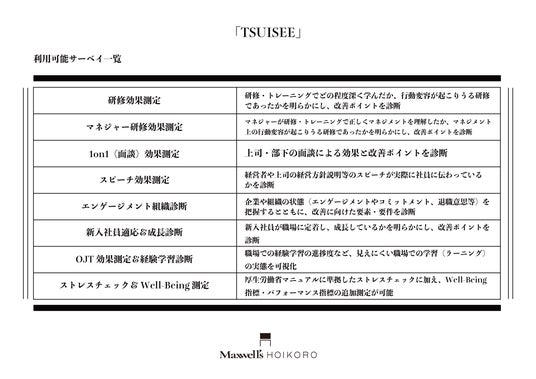 株式会社Maxwell's HOIKORO(マクスウェルズ ホイコーロー、代表:前山匡右、本社:大阪府大阪市西区)は、「本当の人的資本経営を実現する唯一のサーベイアプリケーション」を標榜する「TSUISEE(ツイシー)」を提供するスタートアップ企業です。