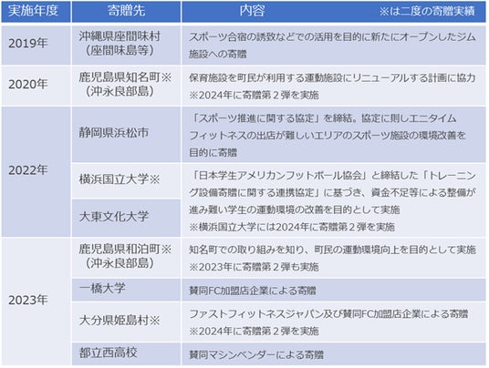 当社では、企業理念である「ヘルシアプレイスをすべての人々へ!」のもと、ESG活動の一環として誰もがフィットネスにつながる機会の創出を目的としたトレーニングマシンの寄贈活動を2018年から実施しております(図1)。これは、エニタイムフィットネスのリニューアル時に発生する入替えマシンを、資金やノウハウの不足等の理由で、トレーニング環境の整備が課題となっている離島などの自治体や学校へ寄贈する活動で、これまでに沖永良部島(鹿児島県知名町・和泊町)や横浜国立大学他への寄贈実績があります。当社のこうした活動に対し、2022年1月に姫島村からマシン寄贈の要請を受け、今回の寄贈に至りました。