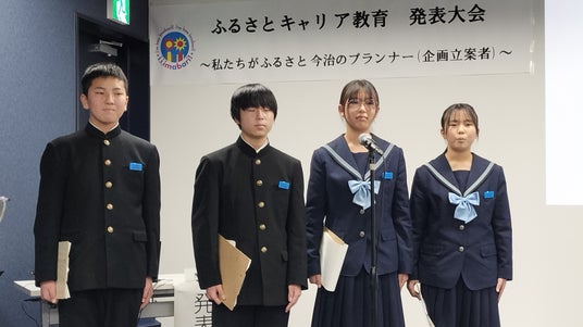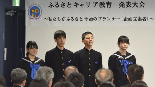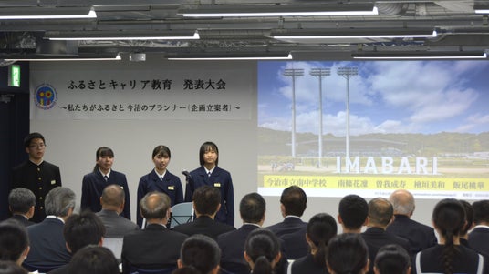 発表大会を終え、「ふるさとキャリア教育」の成果について問われた日吉中学校のメンバーは、「以前は『都会に行きたい』という気持ちが強かったが、学習を通じて今治の魅力を改めて実感した。『今治で暮らすのもいいな』と思うようになり、ふるさとへの愛着が深まった。」と語りました。