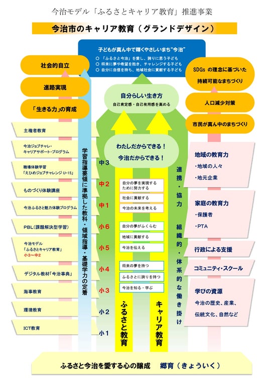 今治市教育委員会が推進する「ふるさとキャリア教育」は、人口減少が進む中で、持続可能な今治市をつくることを目的とした教育プログラムです。小中学生を対象に、今治の魅力や課題を学び、地域への理解と愛着を深めるとともに、課題発見・解決力を養うことを目指しています。