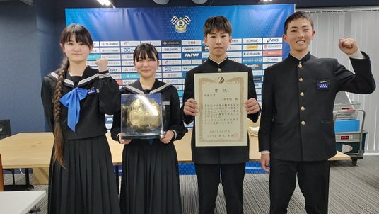 最優秀賞に輝いた今治市立日吉中学校の発表メンバー(左から、野村裕里加さん、岡村咲心さん、吉永陽向さん、岡田悠月さん)