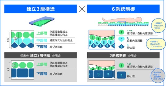 さらに、エアセルを6系統で制御することで、最適な支持を実現。従来構造と比較して、体圧分散性能と除圧性能を高いレベルで両立しています。