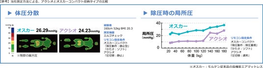 社内試験において、アクシオは従来品と比較し、臀部の最大圧(mmHg)および除圧時の局所圧(mmHg)において優れた数値を確認。