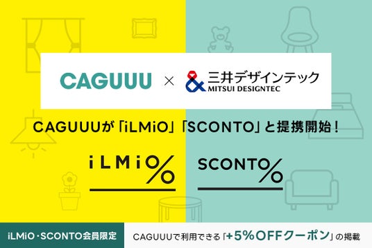 高品質でおしゃれな家具をリーズナブルに提供する家具ブランド「CAGUUU」(運営:CAGUUU株式会社、本社:東京都港区、代表取締役社長:中村勇輝)は、三井デザインテック株式会社(本社:東京都中央区/代表取締役社長:村元 祐介)が運営する会員制クーポンサービス「iLMiO(イルミオ)」および「SCONTO(スコント)」にて、CAGUUUで利用可能な「+5%OFFクーポン」の掲載を開始しました。