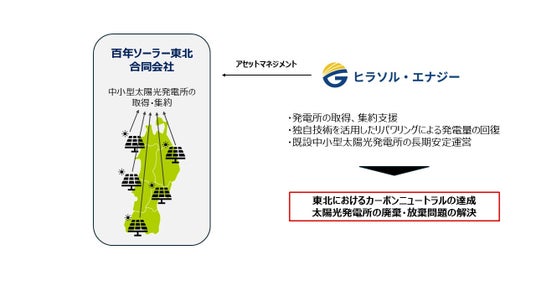 カメイ株式会社(本社:宮城県仙台市、代表取締役社長:亀井 昭男、以下「カメイ」)、三菱UFJ信託銀行株式会社(本社:東京都千代田区、取締役社長:窪田 博、以下「三菱UFJ信託銀行」)、七十七キャピタル株式会社(本社:宮城県仙台市、取締役社長: 今野 晃 )が運営する77ストラテジック・インベストメント第2号投資事業有限責任組合(以下「七十七キャピタル」)、ヒラソル・エナジー株式会社(本社:東京都文京区、代表取締役:李 旻、以下「ヒラソル・エナジー」)は、東北エリアの太陽光発電所を取り巻く廃棄・放棄課題の解決と長期安定稼働による脱炭素化を推進するために、「百年ソーラー東北合同会社(以下「百年ソーラー東北」)」と匿名組合契約を締結し、百年ソーラー東北は株式会社北日本銀行(本店:岩手県盛岡市、取締役頭取:石塚 恭路、以下「北日本銀行」)とプロジェクトファイナンス契約を締結いたしました。