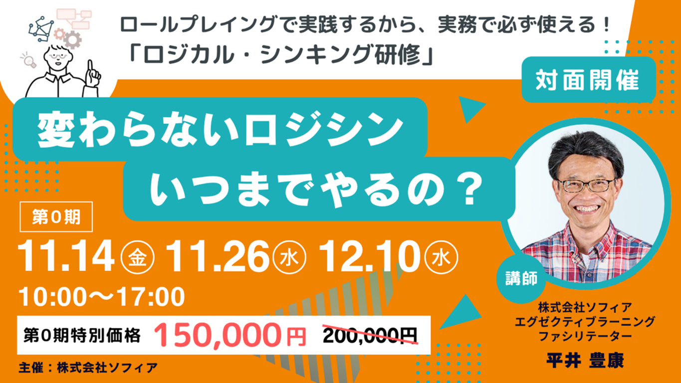 株式会社ソフィア(東京都港区麻布十番、代表取締役:廣田 拓也、以下ソフィア)は【11月14日(金)開催】【変わらないロジシン、いつまでやるの?】実務で使える「ロジカル・シンキング」本講座と題し、無料セミナーを開催します。