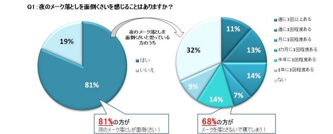 その結果、なんと81%の女性が「夜のメーク落としを面倒くさい」と感じていました。その中で約7割の女性が実際に「1年に1回以上メークを落とさないで寝てしまう事がある」と答え、その頻度は3カ月に1回以上ある女性が約半数を占めました。(データ1.)