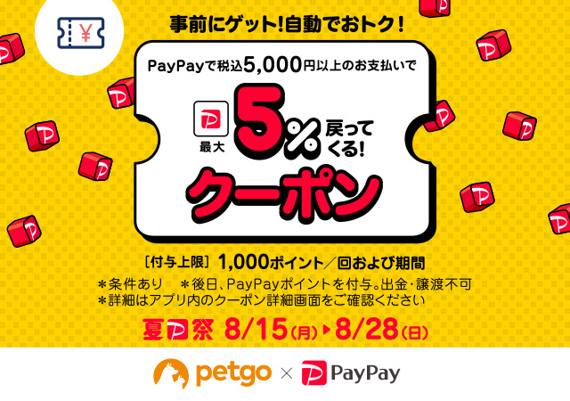 期間中、PayPayを利用してペットゴーにて税込5,000円以上(クーポン・ポイント値引き後・送料手数料含む)購入すると、後日ポイント最大5%が戻ってくるクーポンを配布いたします。