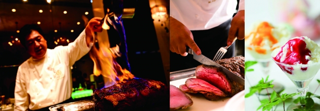 タイムサービスで登場する「黄金のローストビーフ」は、肉質はもちろんのこと、調味料の配合比率から加熱温度までを極限までこだわり抜いた逸品。しっとりと柔らかいお肉を一口噛み締めるごとに、ジューシーな肉汁が口の中いっぱいに広がり、お肉本来の旨みを味わうことができます。シェフが目の前でフランベした出来立てを心ゆくまでご堪能ください。