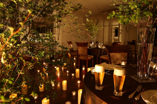 幻想的なキャンドルの光に包まれた緑あふれる非日常空間で、シェフのライヴパフォーマンスによる炎と音の饗宴、贅沢なビアホールをお楽しみください。