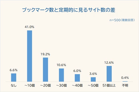 「登録しているもののあまり見ていないサイトは10個以下」という人が多かった一方で、「ブックマークしたもののあまり見ていないサイト」が51個以上ある人も1割以上います。ブックマークしたまま放置しているケースも多いとわかります。