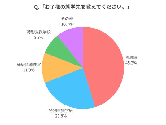 調査の結果、「普通級」に通わせている・通わせる予定と回答した方が45.2%と最も多い結果となりました。また、「通級指導教室」と回答した方は、入学当初は普通級に通わせていたが、先生などに勧められ途中で通級指導教室を選択したというケースが多かったです。