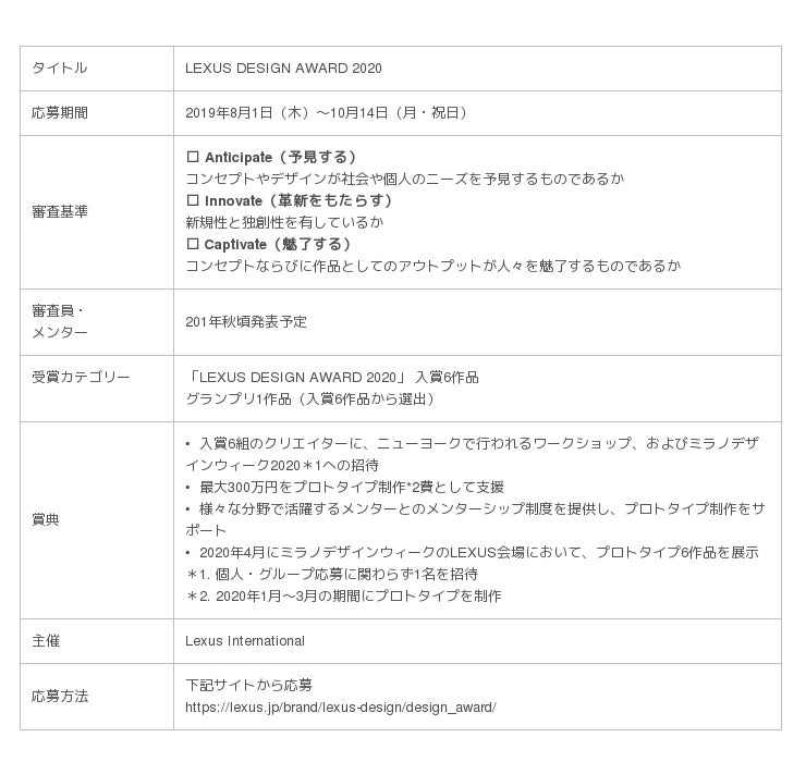 *1. LEXUSが革新的なアイデアで豊かな社会やよりよい未来を創造する気鋭のクリエイターを発見し、育成・支援することを目的に2013年に創設した国際デザインコンペティション。今年で通算8回目を迎え、例年全世界から多数の応募を集めるなど、注目を集めている