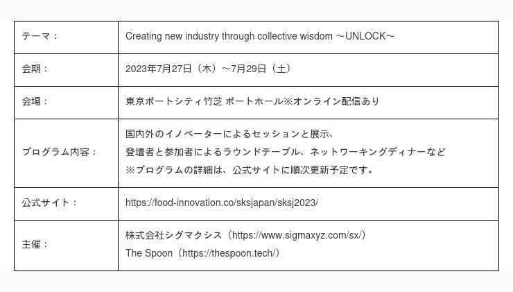 株式会社シグマクシス(本社:東京都港区、代表取締役社長:太田 寛、以下シグマクシス)は、2023年7月27日(木)から29日(土)にわたり、東京ポートシティ竹芝 ポートホールにて、「SKS JAPAN 2023 -Global Foodtech Summit-」をThe Spoon(本社:米国ワシントン州、CEO:Michael Wolf)と共同開催いたします。