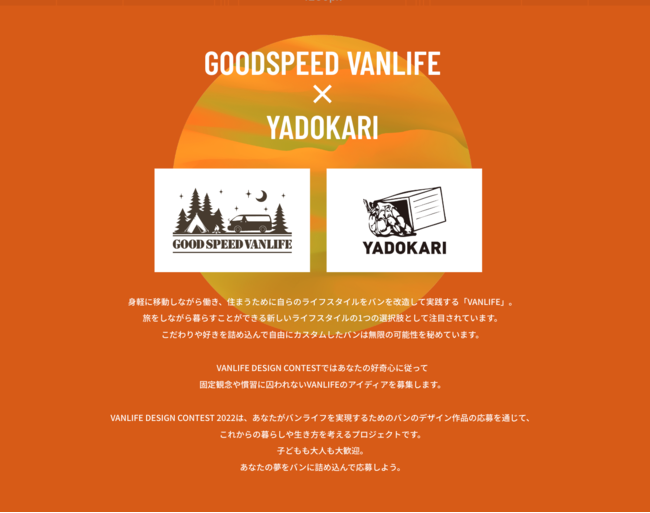 YADOKARI株式会社(本社:神奈川県横浜市/代表取締役CEO:さわだいっせい、代表取締役COO:上杉勢太、以下「YADOKARI」)は、東海エリアにおける2021年度 SUV 販売台数6,000台以上の株式会社グッドスピード(本社:愛知県名古屋市/代表取締役社長:加藤久統、証券コード:7676、東証グロース、以下「グッドスピード」)との協働の下、グッドスピードのキャンピングカー専門店「GOODSPEED VANLIFE 春日井店(愛知県春日井市)」の新ショールームのオープンに合わせ、「VANLIFE DESIGN CONTEST 2022」を開催いたします。身軽に移動しながら働き、住まうライフスタイルとして両社が提案する「バンライフ」をより多く人に届け、可能性を広げるプロモーション企画として、タイニーハウスやバンを使った様々なイベントを手掛けてきたYADOKARIが初めて、バンライフを実現するための車両のデザイン応募を通じて、これからの暮らしや生き方を考えるプロジェクトとして応募作品を募集します。