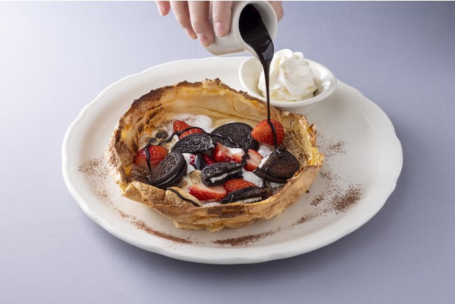 ダッチベイビー生地にマシュマロをのせて香ばしく焼き上げ、いちご、ココアビスケットをトッピング。濃厚なホットチョコレートソースをかけてチョコレート味わいと食感を楽しむダッチベイビー!