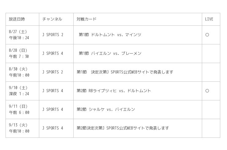 国内最大4 チャンネルのスポーツテレビ局、株式会社ジェイ・スポーツ(本社 東京都江東区、代表取締役社長 木下伸、以下「J SPORTS」 ※)は、8月26日(金)に開幕するドイツ ブンデスリーガを放送することを決定しました。J SPORTSでは注目の日本人選手出場試合や強豪クラブの試合など毎節LIVE1試合、録画2試合、また今シーズンから新たにハイライト番組も放送してまいります。