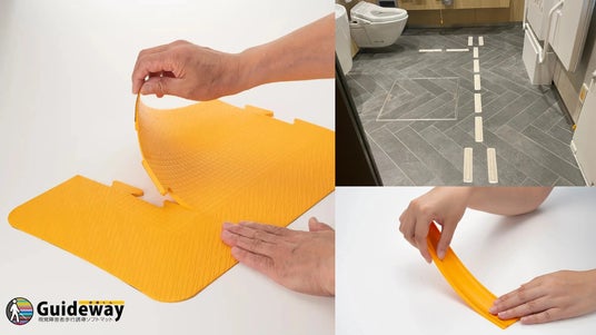 画像の説明:左から時計回りに両面テープで貼る仕様の「歩導くんガイドウェイ」を設置している様子、バリアフリートイレ内の導線を確保するために入り口からトイレまで敷かれたスティック型のマット「ガイドレット」、カットしたココテープを床面に貼り付けている