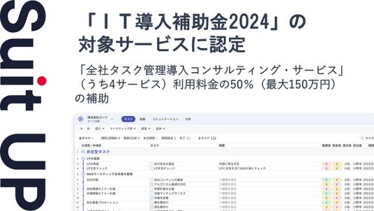 この度、株式会社スーツ(所在地:東京都千代田区、代表取締役社長CEO:小松 裕介)は、「全社タスク管理導入コンサルティング・サービス」のうち、全社タスク管理導入コンサルティング、組織構築コンサルティング、コミュニケーションデザイン・コンサルティング及びタスク設定コンサルティングの4サービスが、「IT導入補助金2024」の対象サービスに認定されたことをお知らせいたします。