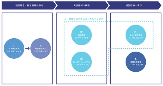 経営タスク・部署タスク・プロジェクトタスクなどの設定をすることにより、クライアント企業様が中長期的に実行すべき全社タスクの「見える化」を実現します。2.経営理念策定コンサルティング