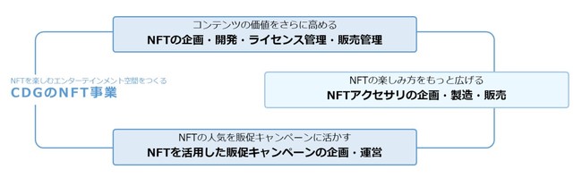CDGは、ノベルティグッズなどの企画や品質管理および製造における独自のノウハウ、また幅広いライセンスホルダーとのネットワークやライセンス管理、コンテンツ開発における豊富な実績を有しています。これらのノウハウや実績をいかし、今後はNFTの企画や販売、またNFTを活用した販促キャンペーンの企画・運用、さらに関連アクセサリの開発も積極的に行い、NFT事業をトータルで運用できる仕組みを創ってまいります。そして、NFTを通じて多くの方々が楽しめる、これまでにないエンターテインメント空間を創っていきたいと考えています。