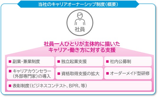 すでに導入している「副業・兼業制度」「表彰制度」をはじめとし、「独立起業支援」「社内公募制」「キャリアカウンセラー(外部専門家)の導入」「資格取得支援の拡大」「オーダーメイド型研修」などを検討しています。これらの取り組みを通して、組織の活性化や組織にコミットする社員の定着化、組織の成長と個々の成長を目指します。