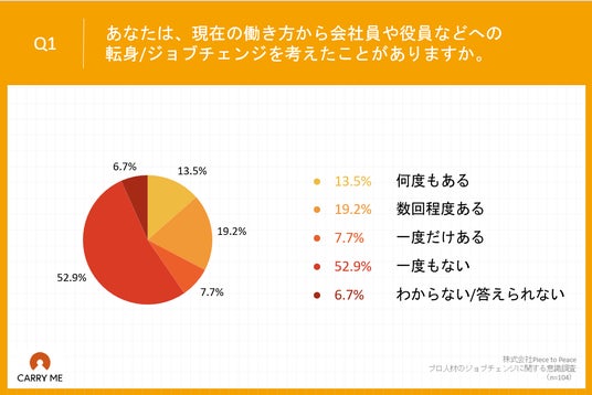 「Q1.あなたは、現在の働き方から会社員や役員などへの転身/ジョブチェンジを考えたことがありますか。」(n=104)と質問したところ、「何度もある」が13.5%、「数回程度ある」が19.2%という回答となりました。