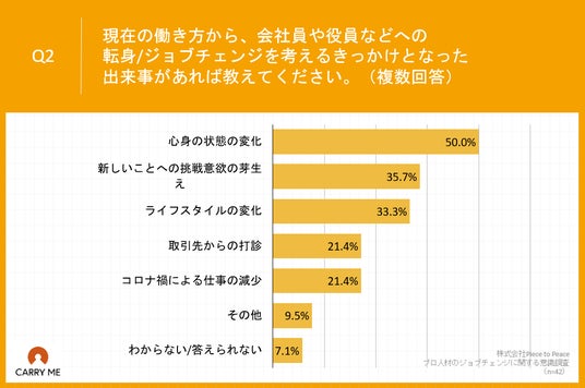 Q1で「何度もある」「数回程度ある」「一度だけある」と回答した方に、「Q2.現在の働き方から、会社員や役員などへの転身/ジョブチェンジを考えるきっかけとなった出来事があれば教えてください。(複数回答)」(n=42)と質問したところ、「心身の状態の変化」が50.0%、「新しいことへの挑戦意欲の芽生え」が35.7%、「ライフスタイルの変化」が33.3%という回答となりました。