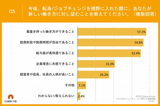 Q1で「何度もある」「数回程度ある」「一度だけある」と回答した方に、「Q5.今後、転身/ジョブチェンジを視野に入れた際に、あなたが新しい働き方に対し望むことを教えてください。(複数回答)」(n=42)と質問したところ、「裁量を持った働き方ができること」が57.1%、「勤務形態や勤務時間が自由であること」が54.8%、「給与面が高待遇であること」が52.4%という回答となりました。