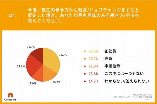 Q1で「何度もある」「数回程度ある」「一度だけある」と回答した方に、「Q4.今後、現在の働き方から転身/ジョブチェンジをすると仮定した場合、あなたが最も興味のある働き方/手法を教えてください。」(n=42)と質問したところ、「正社員」が33.3%、「役員」が16.7%という回答となりました。