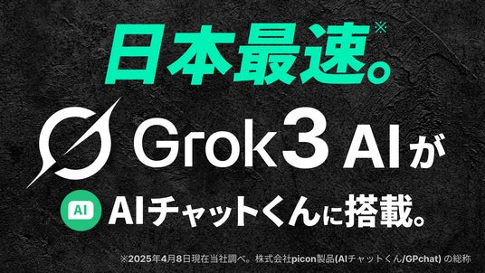 株式会社picon(本社:東京都渋谷区、代表取締役:山口翔誠)は、LINE上で利用可能な対話型AI「AIチャットくん」(ID: ai_chat)に、イーロン・マスク氏率いるxAI社が提供する最新AIモデル「Grok3」を日本国内で最速搭載いたしました。世界最高水準の性能を誇るGrok3の対話力を、LINEで利用可能な日本語特化のAIチャットアプリでどなたでも気軽に体験できます。