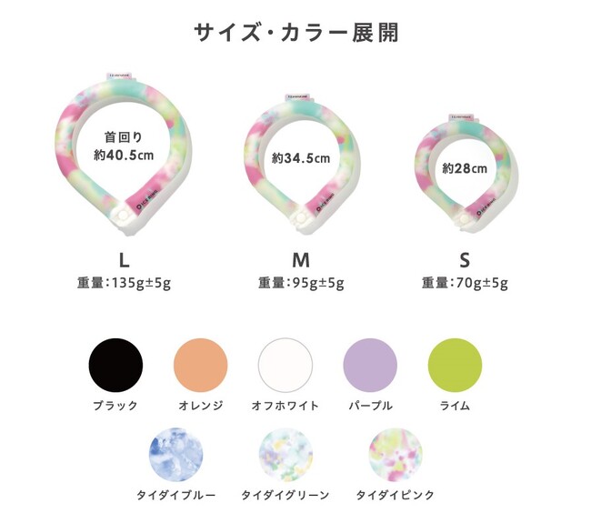 アイスリングの中に入っている温度調節機能を持つ「PCM」と呼ばれる素材は、NASAが宇宙探査時に激しい温度変化から宇宙飛行士を保護するために研究開発され、水よりも約30%比重が低いため軽量で、首への負担が少ないのが特徴。また、通常のアイスリングよりも大き目のサイズになっているため、首元への密着面を広くすることで、効率よく冷やせるような形状に。さらに、ペット用とヒト用で同じカラーリングをご用意したため、大切なペットとお揃いコーディネイトを楽しむことが出来ます。