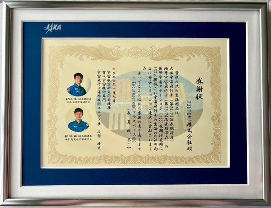 TSUYOMI株式会社(本社:愛知県一宮市、以下「当社」)は、2026年1月9日(金)に開催された、JAXA主催「宇宙生活用品に関する意見交換会」に参加し、共同開発パートナーである日本たばこ産業株式会社(以下JT)と共に大西卓哉宇宙飛行士より感謝状を拝受いたしました。