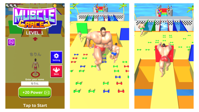 「Muscle Race 3D」は、ステージ上に散らばる「ダンベル」を拾い、筋肉をパンプアップさせることで攻略する筋肉系レースゲームです。パンプアップしたキャラクターを用いて「三輪車を漕ぐ」「ニンジンを抜く」といった競技で対戦相手と競争し、各ステージで1位を目指すことが目的のゲームとなっています。