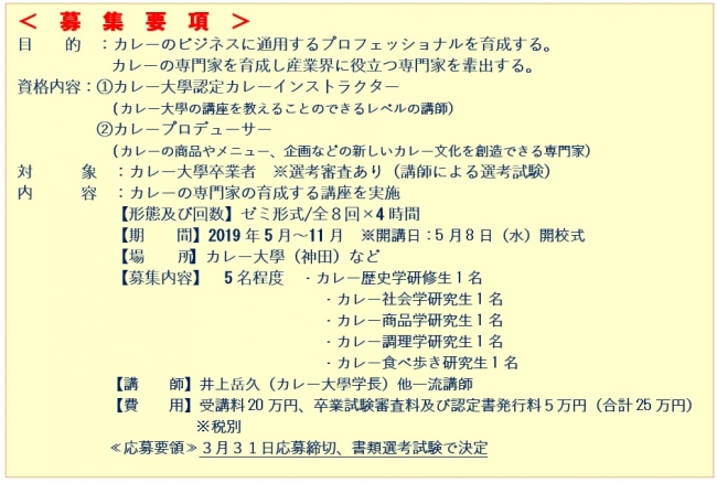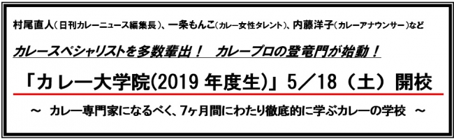日本で唯一のカレー研究情報発信機関、株式会社カレー総合研究所(代表:井上岳久/東京都渋谷区)は、運営するカレー大學において「カレー大学院(2019年度生)」を5月18日(土)から7ヶ月間にわたり開校します。カレー業界を人材供給面から支援し業界を牽引し活力を与える人材を育成することを目的にしています。