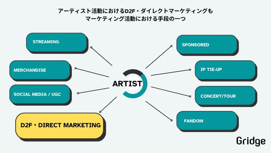 D2F(Direct to Fan)は、アーティストやマネジメントがファンと直接つながるモデルです。CDショップやDSP、代理店などの中間構造に依存せず、公式EC・SNS・メール・CRMなどのツールを通じて、ファンとの継続的な接点を自分たちで保つ設計です。