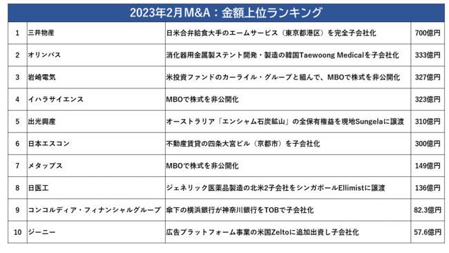 金額トップは2カ月連続で三井物産による買収案件で、日米合弁給食会社のエームサービス(東京都港区)を完全子会社化します。現在、三井物産と米国アラマークが折半出資しているものを、約700億円を投じて残り株式を買い取ります。意思決定を迅速化し、成長が見込まれるウェルネス(健康)分野の事業拡大を加速する狙いです。買収完了は4~6月中を見込みます。