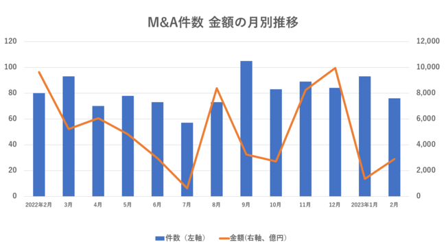2023年2月のM&A件数(適時開示ベース)は前年比3件減の77件となり、7カ月ぶりに前年を下回りました。海外案件は18件と高水準で推移したものの、これまで牽引役だった国内案件のペースダウンが響きました。1~2月累計は170件で前年を26件上回る一方、2月の取引金額は2886億円(公表分を集計)で、前年の3割程度にとどまりました。