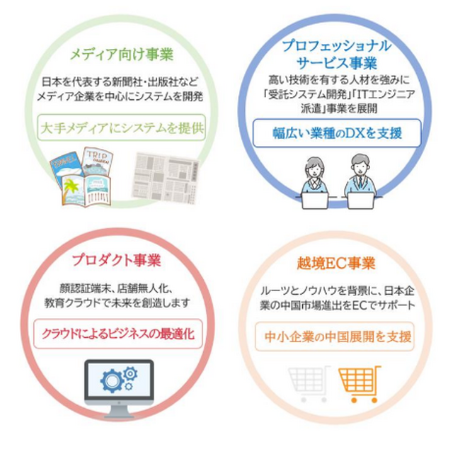 HOUSEIは、DXを実現するパートナーとして、「メディア向け事業・プロフェッショナルサービス事業・プロダクト事業・越境事業」の4つの事業を柱に、日本のDX化を図ります。